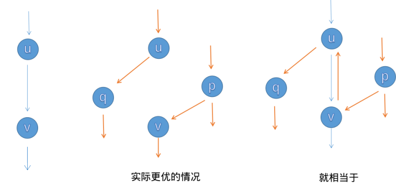 𝐺 G 上有多条增广路,其中,我们选择进行一次先后经过 𝑢 , 𝑣 u , v 的增广(如左图所示),流量增加 1 1 。我们注意到,如果进行中图上的增广,这个局部的最大流量不是 1 1 而是 2 2 。但由于指向 𝑢 u 的边和从 𝑣 v 出发的边在第一次增广中耗尽了容量,此时我们无法进行中图上的增广。这意味着我们当前的流是不够优的,但局部可能已经没有其他(只经过原图中的边而不经过反向边的)增广路了。 现在引入退流操作。第一次增广后,退流意味着 𝑐 𝑓 ( 𝑣 , 𝑢 ) c f ( v , u ) 增加了 1 1 剩余容量,即相当于新增 ( 𝑣 , 𝑢 ) ( v , u ) 这条边,因此我们可以再进行一次先后经过 𝑝 , 𝑣 , 𝑢 , 𝑞 p , v , u , q 的增广(如右图橙色路径所示)。无向边 ( 𝑢 , 𝑣 ) ( u , v ) 上的流量在两次增广中抵消,我们惊奇地发现两次增广叠加得到的结果实际上和中图是等价的。
