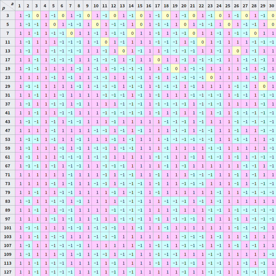 𝑎 a 是模 𝑝 p 的二次剩余当且仅当 ( 𝑎 𝑝 ) = 1 . ( a p ) = 1. 𝑎 a 是模 𝑝 p 的二次非剩余当且仅当 ( 𝑎 𝑝 ) = − 1 . ( a p ) = − 1. 下表为部分 Legendre 符号的值(From Wikipedia )